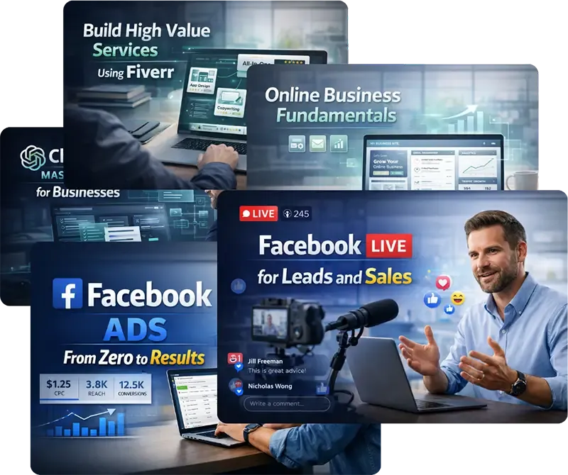 - Ready-to-Sell Courses and Ebooks — multiple subjects designed for marketers, entrepreneurs, and business owners; covering topics like Facebook marketing, lead generation, and more
